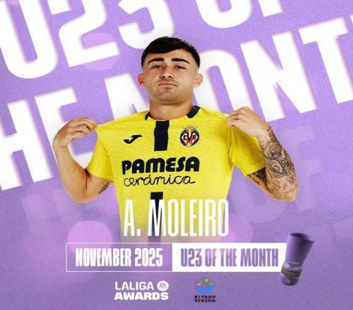 莫莱罗当选西甲EA SPORTS11月最佳U23球员。该奖项由西班牙足球甲级联赛与利雅得赛季联合颁发。这位出身加那利群岛的年轻球员在11月表现极为亮眼,已然成为这支位于卡斯特利翁省的球队阵容中的核心球员。他凭借出色的场上视野、强劲的防线突破能力以及极具冲击力的进攻拼劲,成为比利亚雷亚尔队在本赛季当前阶段保持优异战绩的关键所在。